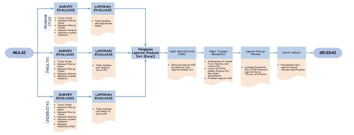 Sistem Penjaminan Mutu Internal (SPMI) UNU KALTIM mengacu pada undang-undang Nomor 12 Tahun 2012 melalui sistem penjaminan mutu internal (SPMI) perguruan tinggi dan sistem penjaminan mutu eksternal (SPME) melalui akreditasi oleh Badan akreditasi nasional perguruan tinggi (BAN-PT) ataupun Lembaga akreditasi mandiri (LAM). di dalam menjaga budaya mutu penyelenggaraan pendidikan perguruan tinggi secara sistemik pada SPMI perguruan tinggi perlu adanya praktik baik (Gambar 1, 2, 3 dan 4) mengacu pada peraturan menteri riset, teknologi, dan pendidikan tinggi republik indonesia Nomor 62 Tahun 2016 tentang perencanaan/penetapan, pelaksanaan , evaluasi, pengendalian dan pengembangan/peningkatan di perguruan tinggi terhadap standar pendidikan tinggi yang terbagi menjadi dua yakni standar nasional pendidikan tinggi yang ditetapkan oleh peraturan menteri pendidikan dan kebudayaan republik indonesia Nomor 3 tahun 2020 yang diperbaharui menjadi Nomor 53 tahun 2023 dan standar pendidikan tinggi yang ditetapkan oleh perguruan tinggi/institusi itu sendiri sebagai pelampauan kuantitatif dan kualitatif