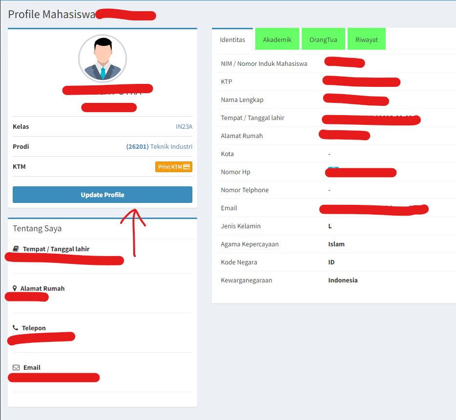 - Masuk ke menu Profil / Biodata Mahasiswa lalu klik tombol update profile.