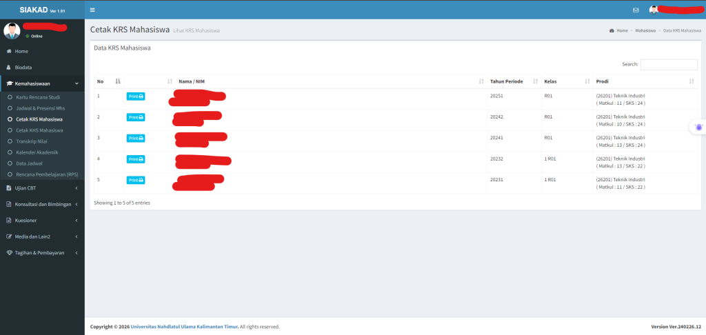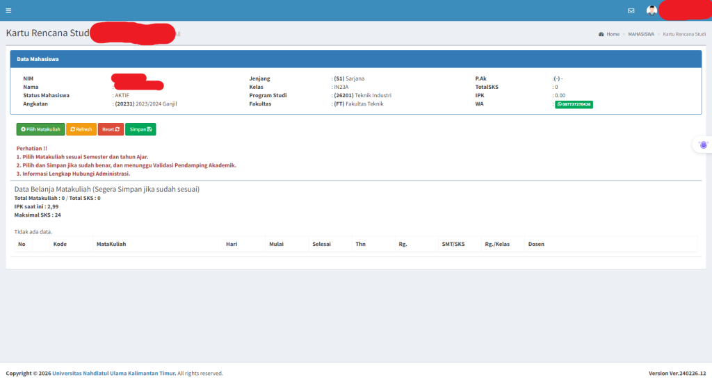 Pengisian Kartu Rencana Studi (KRS) dilakukan secara online melalui Sistem Informasi Akademik (SIAKAD) Universitas Nahdlatul Ulama Kalimantan Timur. Sistem ini merupakan aplikasi berbasis web yang digunakan untuk mengelola berbagai layanan akademik mahasiswa seperti KRS, nilai, dan informasi perkuliahan.