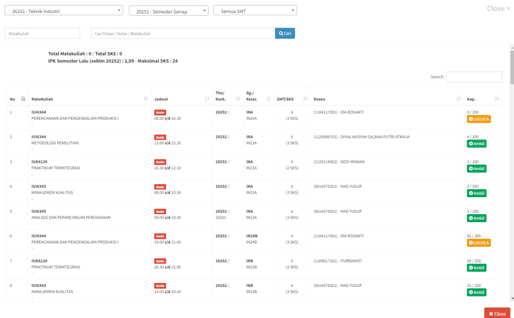 Klik Ambil / Tambahkan pada mata kuliah yang ingin diambil.